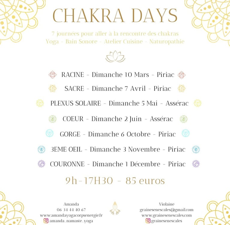 C’est le moment de profiter d’une journée - Retraite de Yoga - de se faire du bien et de venir voyager à travers de chaque centre énergétique et les émotions qu’il dirige ! Es tu prêt•e pour partir à la découverte de Toi ?